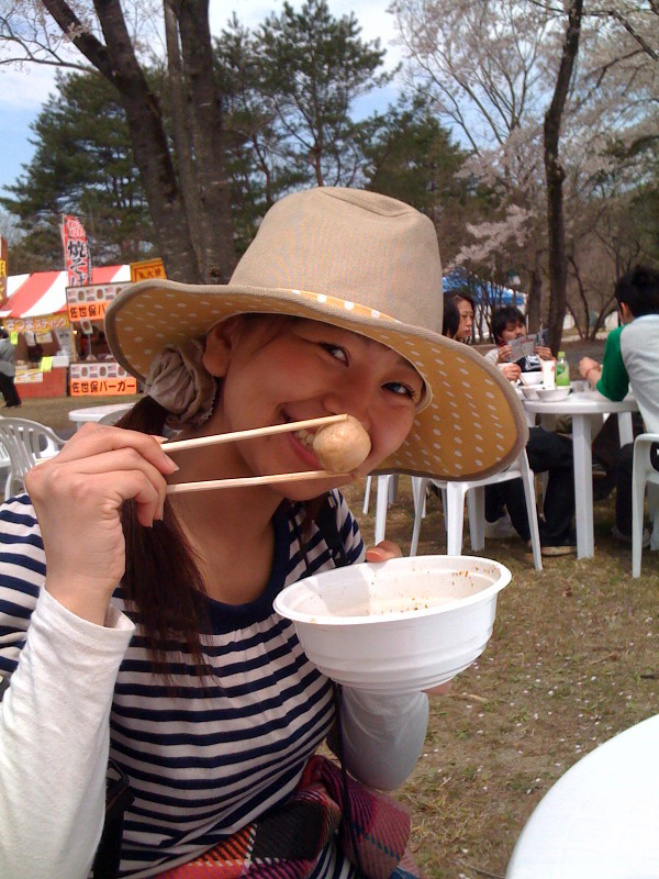 入場してすぐ、各地の様々な美味しいものの屋台が軒を連ねており、早速、山形の「美味しい玉こんにゃく」の文字に惹かれて、「く〜ださい!」と注文するも、まだ仕込んだばかりで、味が沁みてないからと、一個だけ突き刺した串をサービスでくれる。あふあふ、美味しい。でも、やっぱりまだ味がしない。(^^;)